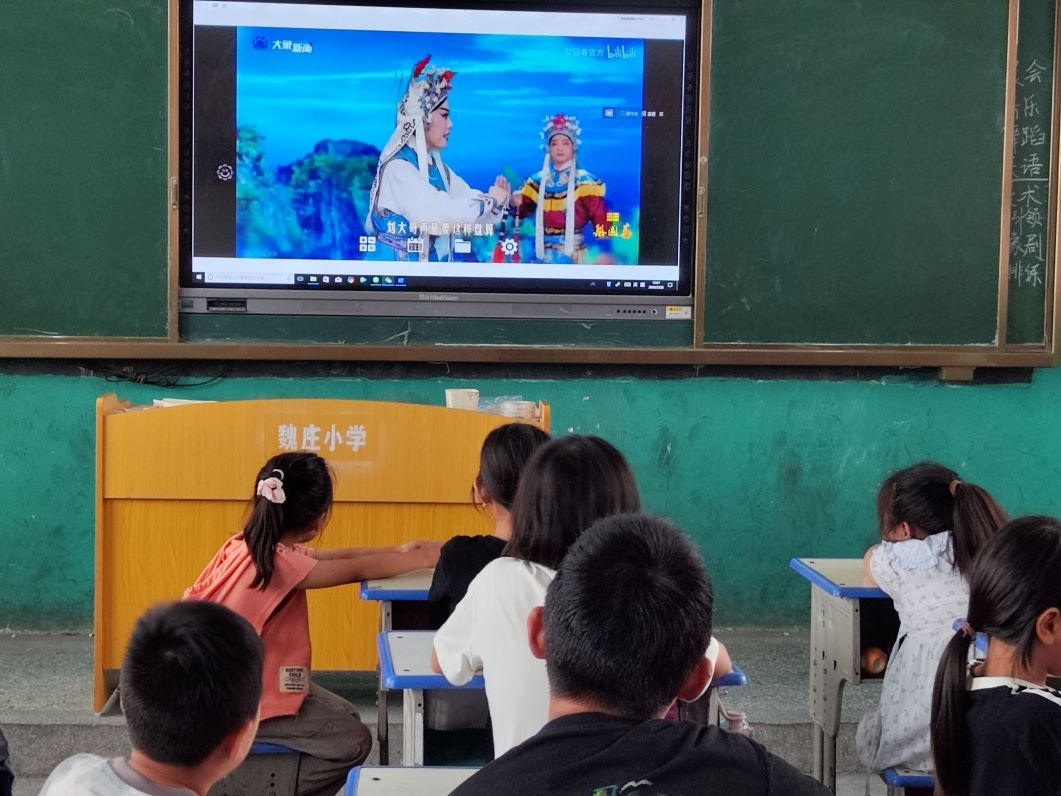 在系統(tǒng)學(xué)習(xí)豫劇的基本知識之后,孩子們對豫劇文化有了一個初步的認(rèn)識。大家的眼神中充滿了興奮,意外于在自己最為親切的土地上,竟能生長出這樣豐富多彩的文化寶藏。“老師老師,那豫劇唱起來是什么樣的啊?”有同學(xué)好奇地問道。緊接著,支教團(tuán)成員便帶領(lǐng)大家一同觀賞了著名的豫劇選段《花木蘭》。在講解過后,觀賞的形式能讓孩子們更直觀,更全面地感受豫劇。孩子們沉浸地觀看,感受著劇中高亢明亮的唱腔,生動傳神的表演以及簡練而有深意的語言和唱詞?!痘咎m》這一選段,既展現(xiàn)了慷慨激昂的戰(zhàn)斗場面,也展現(xiàn)了柔情似水的兒女情長,充分展現(xiàn)了豫劇唱腔的豐富性和表現(xiàn)力。此外,花木蘭這一人物忠孝、勇敢、智慧和溫柔等性格特征在劇中被刻畫得淋漓盡致,深深感染著孩子們。
