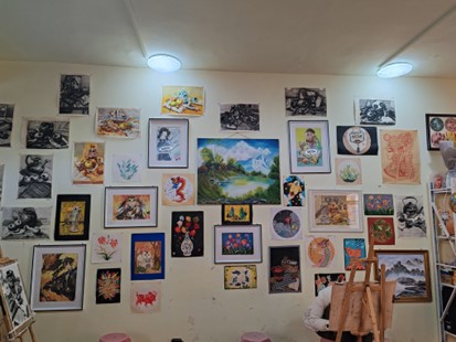 在學(xué)生創(chuàng)作的間隙,實(shí)踐隊(duì)員對(duì)楊云老師進(jìn)行了深入的訪談。楊老師來自一個(gè)藝術(shù)世家,自幼受到家族中手工藝人的熏陶,從而決定繼承這一傳統(tǒng)技藝。作為該技藝的第五代傳人,楊老師不僅致力于作品的設(shè)計(jì)與創(chuàng)作,還通過藝術(shù)教育機(jī)構(gòu)將此技藝普及給更多的人群。他不僅在校園內(nèi)指導(dǎo)學(xué)生學(xué)習(xí)這項(xiàng)技藝,還積極前往各學(xué)校開展教師培訓(xùn),以及推動(dòng)非物質(zhì)文化遺產(chǎn)進(jìn)校園、進(jìn)社區(qū)的活動(dòng)。在訪談過程中,實(shí)踐隊(duì)員注意到了楊老師兩位特殊學(xué)生的表現(xiàn),盡管他們面臨表達(dá)上的困難或使用助聽器,卻依然能夠展現(xiàn)出更為卓越和專注的特質(zhì),生動(dòng)地詮釋了“上帝為他們關(guān)閉了一扇門,必將為他們開啟另一扇窗”的哲理。