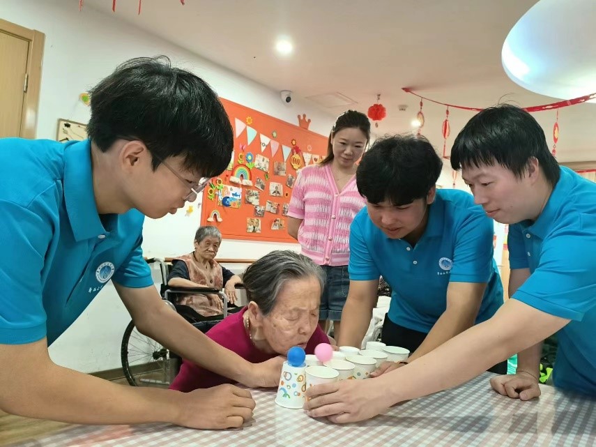 圖為實踐隊員與老人進(jìn)行吹球活動