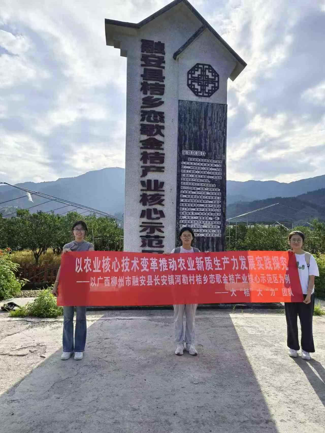 (圖為團(tuán)隊(duì)成員在融安縣長安鎮(zhèn)河勒村桔鄉(xiāng)戀歌金桔產(chǎn)業(yè)核心示范區(qū)前合影留戀)