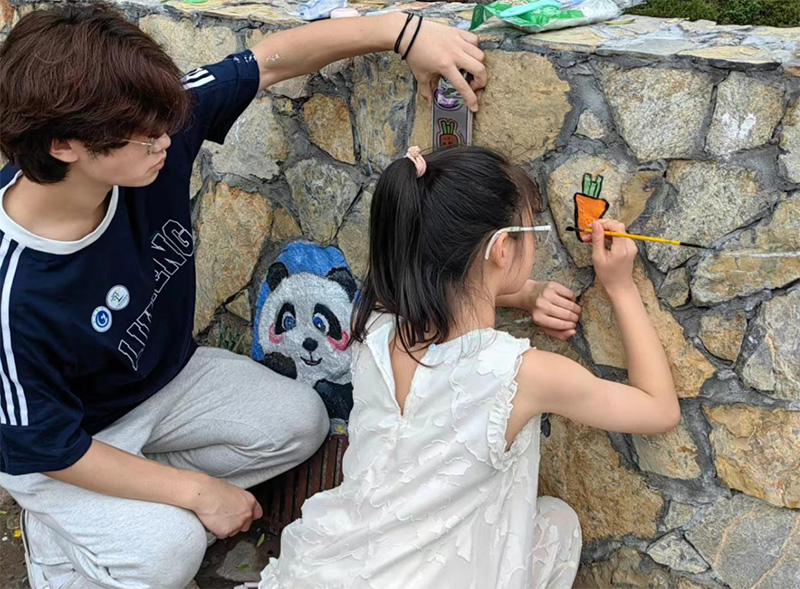 實踐團意外地遇到了一家畫室正帶領學生們進行研學活動。在得知我們的墻繪項目后,他們熱情地邀請我們?yōu)樗麄兊膶W生傳授墻繪技巧。經(jīng)過與村里負責人的協(xié)調(diào)后,我們欣然接受了這一邀請。在隨后的一個半小時里,我們與10多名小朋友共同度過了一段難忘的時光。他們的繪畫功底扎實且充滿想象力,而且非常乖巧聽話,在他們的配合下,我們共同完成了一幅幅充滿童趣的作品,也讓我們在教學過程中收獲了無盡的快樂與滿足。