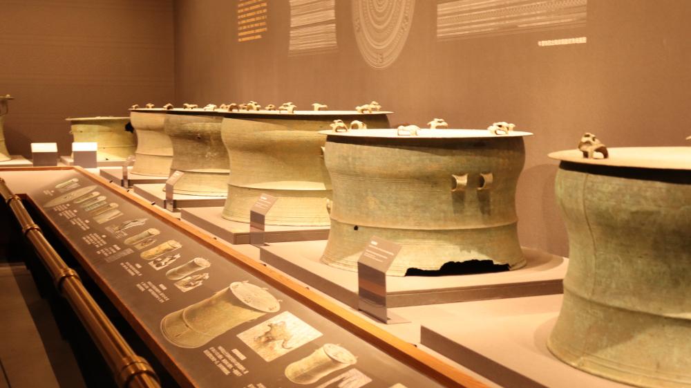 其中,最引人注目的還是廣西民博的鎮(zhèn)館之寶——云雷紋大銅鼓,它是迄今世界上最大的銅鼓,是中國南方先民創(chuàng)造的禮樂器物,講述著2000年前在廣西這片土地上各民族間文化交流的故事。