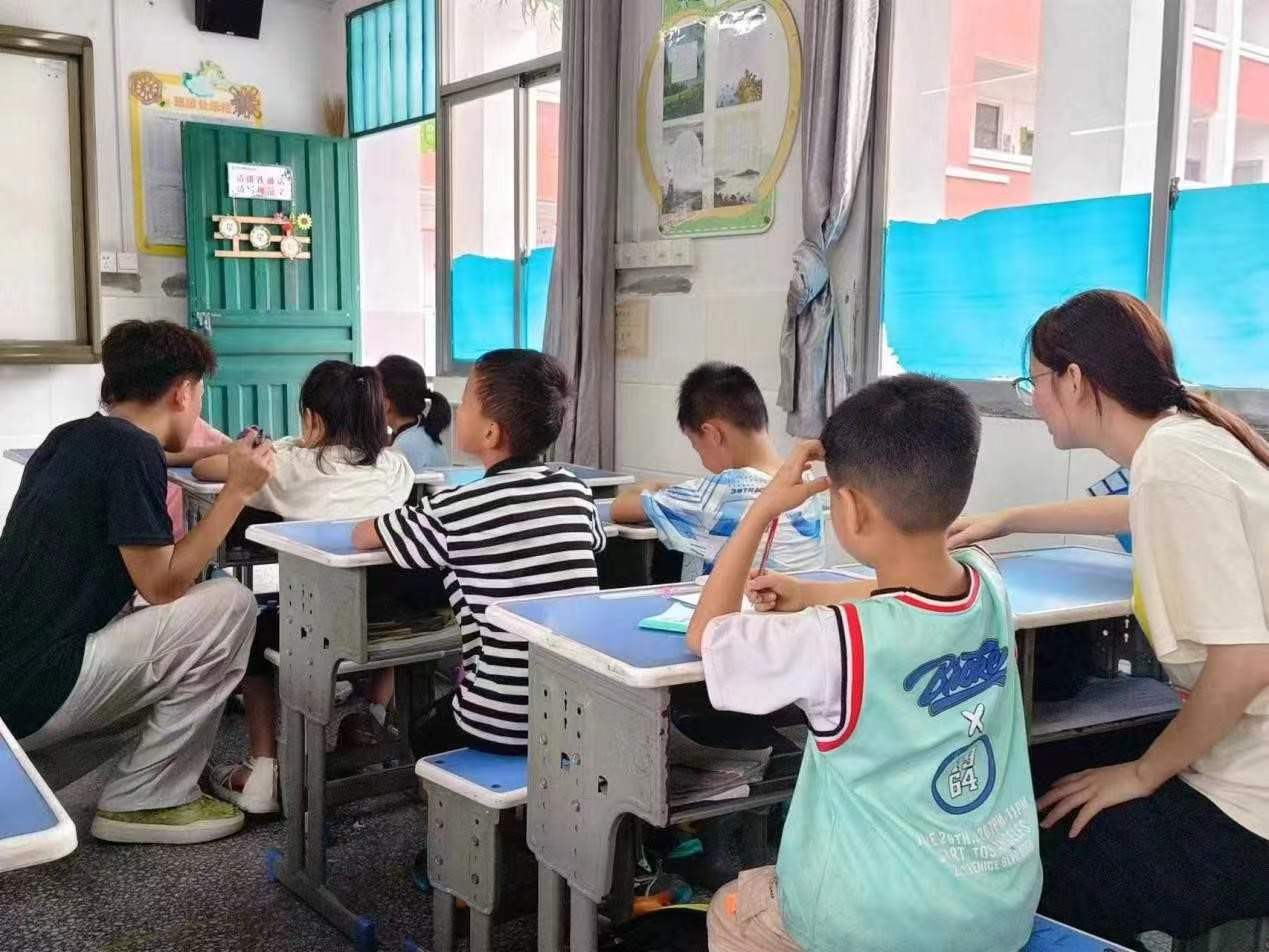 圖為蒲公英實踐團(tuán)隊為孩子們輔導(dǎo)功課。 梁文璽 攝