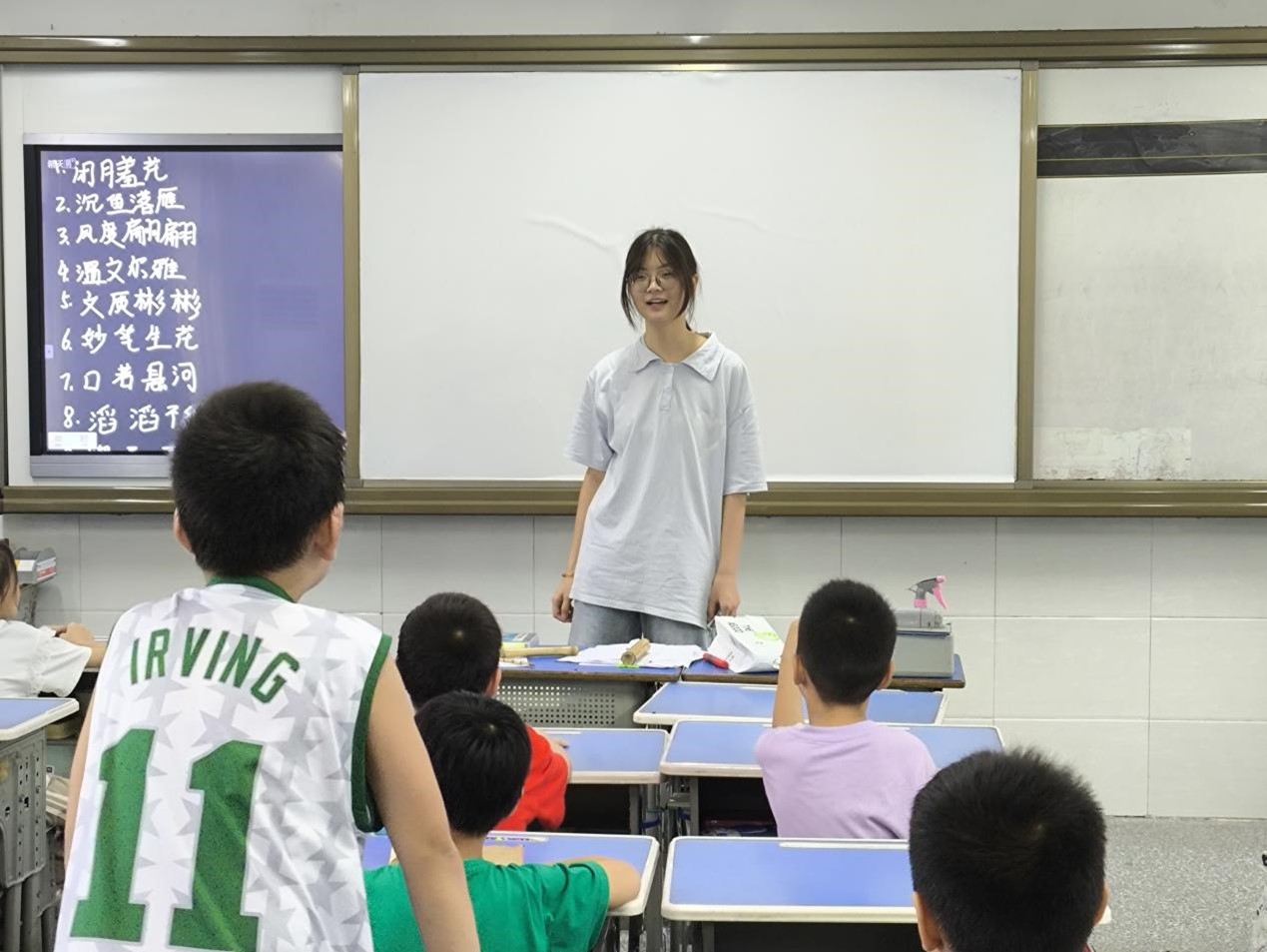 圖為蒲公英實(shí)踐團(tuán)團(tuán)隊(duì)成員為孩子們上語(yǔ)文課。 徐舒婷 摂