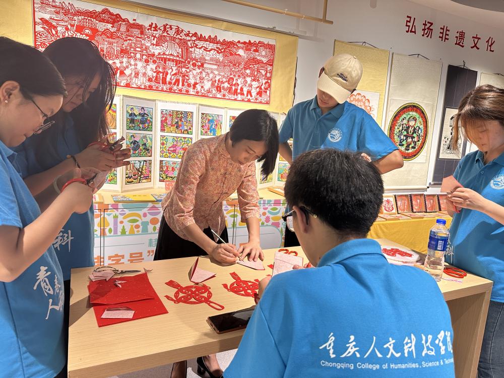 (圖為鐘老師指導實踐團成員剪紙創(chuàng)作)