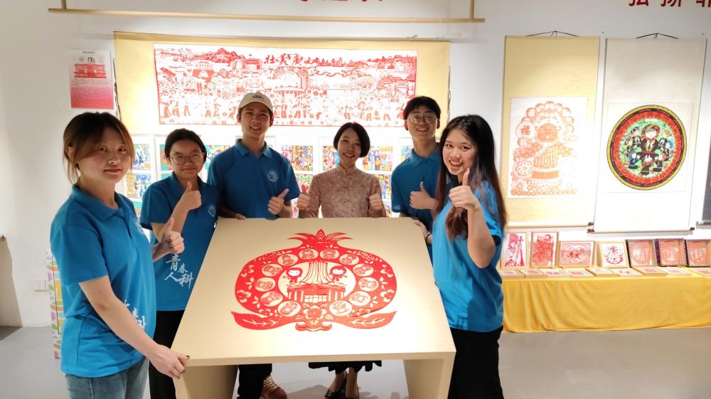 (圖為實踐團成員與鐘老師及其她的剪紙代表作合影)
