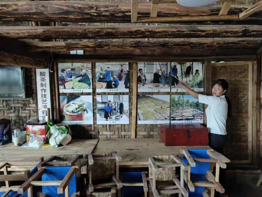 酸茶體驗(yàn)坊內(nèi),非遺傳承人趙臘退身著民族服飾,講述著他的酸茶技藝傳承故事。紙上得來終覺淺,據(jù)他回憶,僅為實(shí)踐好酸茶的厭氧發(fā)酵這一步,他就歷經(jīng)了七八年之久。他表示,作為傳承人和村主任,比別人更多的是一份責(zé)任。十幾年來,他對(duì)這項(xiàng)技藝不懈探索精進(jìn),希望通過自己的努力,吸引更多人關(guān)注并參與到酸茶文化的傳承中來。