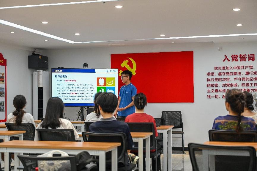 實踐隊于世紀城進行宣講 陳同鑫攝在宣講中,面對中小學生與老年人,講解的隊員選擇用日常生活中各類能源的使用引入話題,深入淺出地解析了傳統(tǒng)能源與新能源的差異,隨后,通過對比的方式分別介紹傳統(tǒng)能源與新型清潔能源的優(yōu)勢與缺陷,特別是強調了太陽能、風能等可再生能源的重要性及其在減少碳排放、保護環(huán)境方面的積極作用。他們特別強調了這些技術在城市居民生活中的實際應用,如屋頂光伏電板和社區(qū)風力發(fā)電設施的建設,以及如何通過政策支持和技術創(chuàng)新推動新能源的普及。整個宣講過程通過生動的案例和互動問答,讓抽象的能源知識變得生動有趣,激發(fā)了居民們對綠色能源的好奇心和探索欲。在同學們對能源轉型有了一定的了解后,宣講人又將話題回歸生活,向居民們呼吁“在日常生活中節(jié)約能源,為能源轉型貢獻一份力量。”“在與同齡人的交流中,我們更能理解對方思維中與自己共振的那部分,交談也更加順利。”面對與實踐隊成員年齡相近、充滿活力和創(chuàng)造力的青少年,實踐隊員開展座談會,鼓勵他們勇敢提出自己的想法和創(chuàng)意,圍繞節(jié)能減排、新能源應用等主題展開頭腦風暴。在生活上,探討如何通過小型太陽能發(fā)電裝置和風力發(fā)電機在家庭中使用可再生能源,分享自己所了解到的智能家居系統(tǒng)、節(jié)水裝置和高效能源設備。也探討了節(jié)能減排的最新技術進展、全球能源趨勢以及雙碳政策的重要性與關鍵作用。也提出自己對于如何在日常生活中響應國家雙碳政策,履行個人責任的問題的見解。座談會后,雙方人員對于“為減緩氣候變化、改善環(huán)境質量、提高能源安全性和可持續(xù)性,創(chuàng)造可持續(xù)發(fā)展的有利條件,能源轉型刻不容緩。”這句宣傳標語的認可更加深刻,也表示會用實際行動為綠色能源的未來貢獻力量。