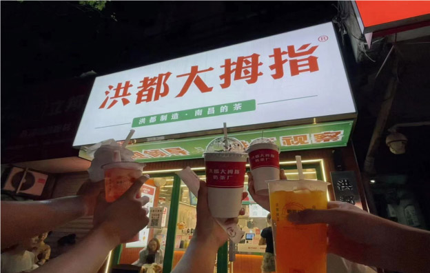 隨著時代的飛速發(fā)展,奶茶作為一種新興飲品迅速在各個城市里扎根,各地都有屬于自己的奶茶品牌,此次團(tuán)隊(duì)成員也品嘗了南昌的獨(dú)特奶茶品牌洪都大拇指。洪都大拇指的雪頂系列,通過奶油與牛奶的結(jié)合增加了口味的層次感,同時洪都大拇指也提供烤腸和小吃,深受顧客的喜愛。