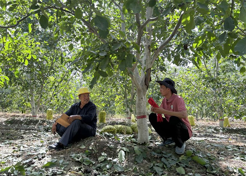 ?。▓D為團(tuán)隊(duì)成員葉爾扎提·葉爾哈孜與核桃種植戶交流)