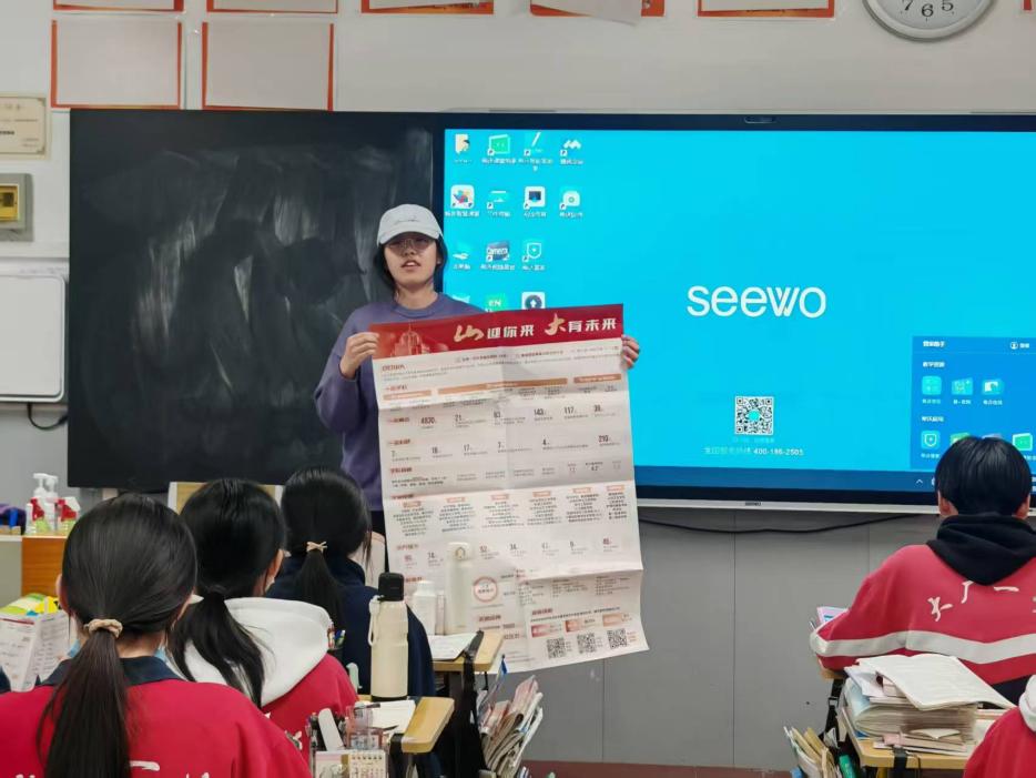 2月14日,何依諾回到熟悉的校園,開(kāi)啟宣講之旅。過(guò)程伊始,她發(fā)放了宣傳資料并具體地介紹了山東大學(xué)的學(xué)風(fēng)建設(shè)、師資力量、專業(yè)設(shè)置、教育模式等信息,解讀了山東大學(xué)招生計(jì)劃及人才培養(yǎng)方案,分享了山大的學(xué)習(xí)與生活體驗(yàn),也將提前準(zhǔn)備的驚喜“大學(xué)生活VLOG”向?qū)W弟學(xué)妹展示,讓他們更直觀更真實(shí)地感受大學(xué)校園生活的魅力。而后,她便就“備戰(zhàn)高考”為題開(kāi)始分享一些方法與心得,涉及了文科以及語(yǔ)數(shù)英三大主科的各種方法,以及面對(duì)不同題型的應(yīng)對(duì)策略,也延伸到了與大學(xué)某些學(xué)科相銜接的學(xué)習(xí)內(nèi)容,希望這些內(nèi)容能為學(xué)弟學(xué)妹今后的學(xué)習(xí)生活助一份力。