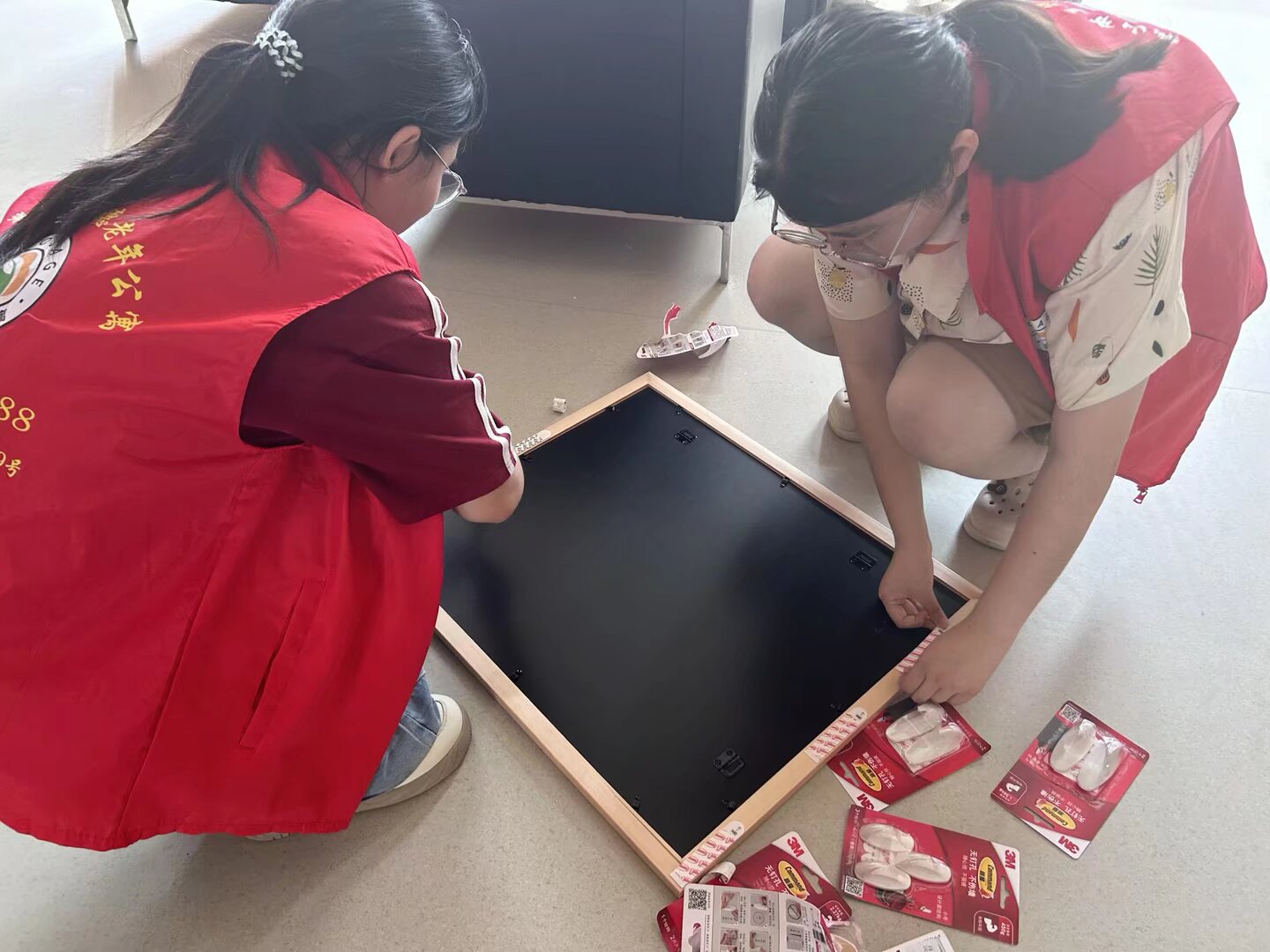 圖為志愿者們?cè)谡迟N畫(huà)框。 郭弋歌 供圖