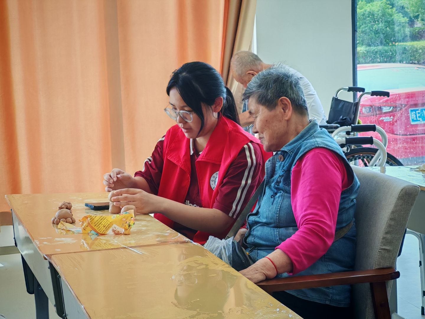 圖為志愿者和老人一同制作陶泥手工。 趙祎婷 供圖
