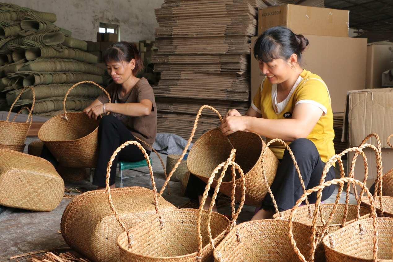 在編織區(qū),工人專注產(chǎn)品的場(chǎng)景映入眼簾,一挑一壓間,質(zhì)樸的蒲草化作精致籃筐。同學(xué)們近距離