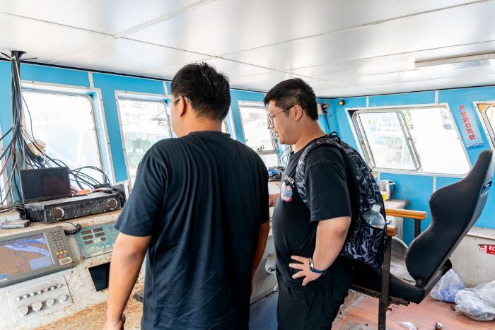 圖為團(tuán)隊(duì)成員參觀漁船的駕駛室 潘弈攝