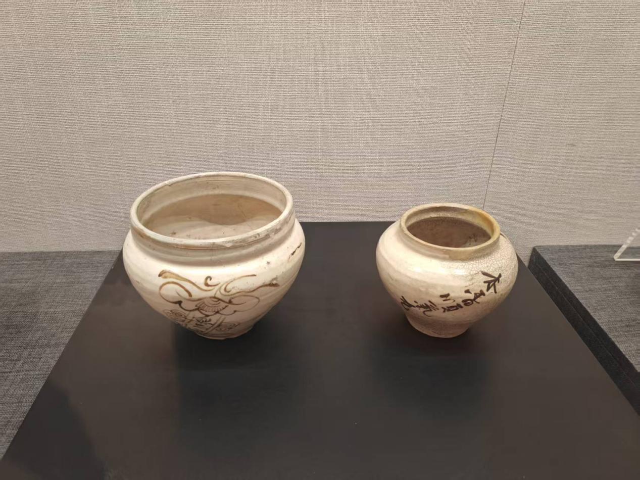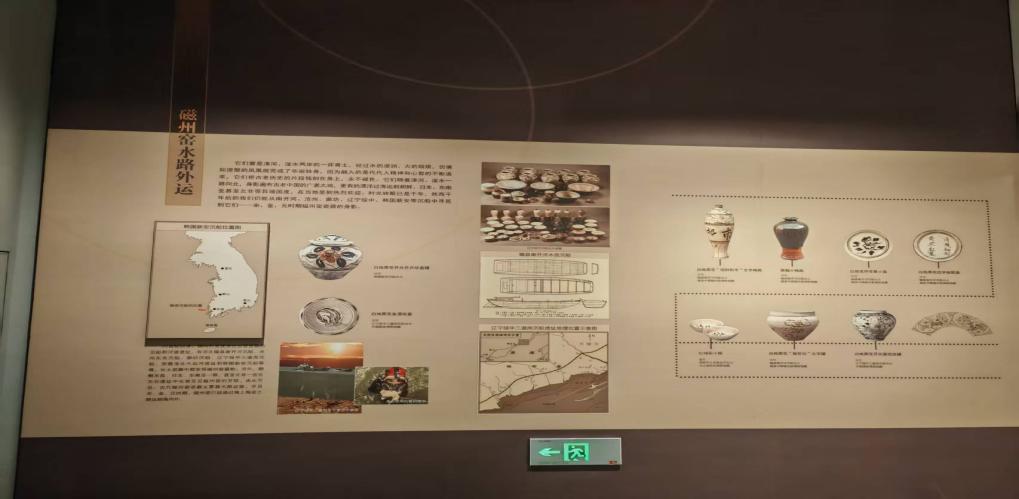 漳河·滏陽河外運(yùn)圖,整面墻繪出磁州窯水路:漳河入衛(wèi)運(yùn)河,在天津出海;南下?lián)P州,東去高麗、日本、北非。展柜里白地黑花“花白”文字碗、開光嬰戲紋罐,正是韓國新安沉船出水同款。我們把航線圖與瓷片并置拍攝,“小小瓷碗,當(dāng)年也乘宋元巨輪遠(yuǎn)渡重洋。”