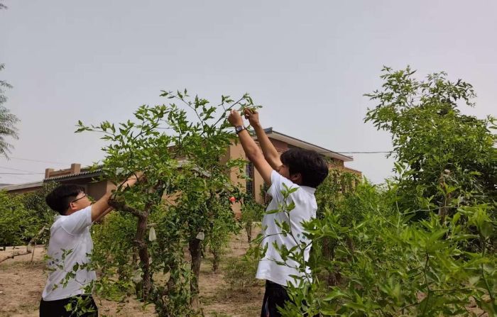 在大田實踐環(huán)節(jié),成員們來到紅棗種植基地,開展去除棗樹頂端優(yōu)勢作業(yè),親身體驗了松土、施肥等農(nóng)事操作。通過修剪優(yōu)化植株養(yǎng)分分配,提升紅棗坐果潛力。同時,學習依據(jù)葉片、果實特征識別棗縮果病、桃小食心蟲等病蟲害,掌握綠色防控手段。成員們將理論知識用于實踐,提升專業(yè)能力,也體會到科學種植對紅棗品質(zhì)與產(chǎn)量提升的關(guān)鍵作用。