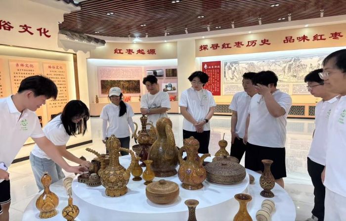 在文化展示環(huán)節(jié),開熱木拉·阿布都艾尼老師深入闡釋紅棗民俗文化,講述紅棗在新疆節(jié)慶、飲食、民俗中的重要象征意義。此外,還展示了古代用于盛放棗及制作棗制品的器皿,其中不乏造型精美的酒壺狀容器。這些器皿不僅體現(xiàn)古人以棗釀酒、制醬的智慧,更承載著千年棗文化的厚重底蘊,讓成員們深刻感受到紅棗不僅是農(nóng)產(chǎn)品,更是傳承歷史的文化符號。