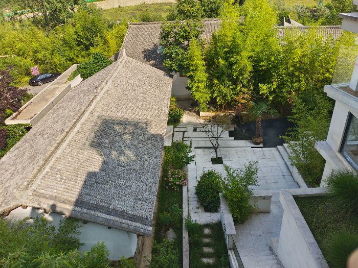 實(shí)踐隊(duì)首先考察了陽(yáng)坡院子。作陽(yáng)坡院子為全國(guó)甲級(jí)旅游民宿,其在保留陜南傳統(tǒng)夯土墻、坡屋頂與院落形制的基礎(chǔ)上,植入鋼構(gòu)玻璃、民國(guó)木格窗與少量工業(yè)鐵藝,實(shí)現(xiàn)“新舊共生”。陽(yáng)坡院子以院落為單元,共計(jì)6個(gè)各具特色的院落。