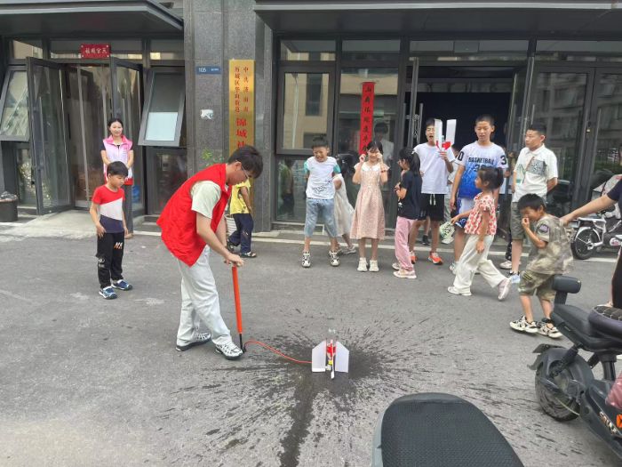 7月16日,山東大學(xué)學(xué)生春暉社纖羽傳信支教隊(duì)在濟(jì)南歷城錦城社區(qū)開展主題為“點(diǎn)燃科學(xué)夢,厚植航天情”的線下水火箭科學(xué)實(shí)踐課。這場水火箭科學(xué)實(shí)踐課,帶著孩子們解碼航天奧秘,在探索中點(diǎn)燃科學(xué)夢想,厚植航天情懷,讓“探索浩瀚宇宙,發(fā)展航天事業(yè),建設(shè)航天強(qiáng)國,是我們不懈追求的航天夢”這一殷切囑托,在孩子們心中悄然扎根。