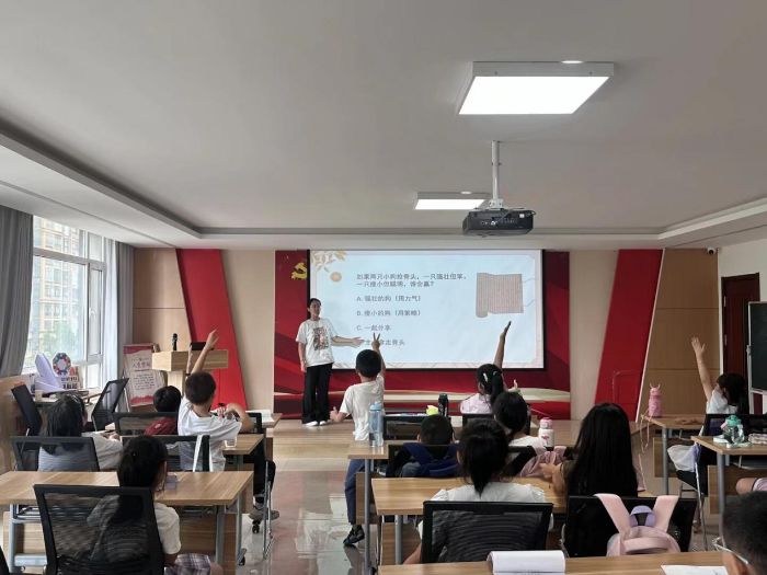 第一環(huán)節(jié)“兵法寶典知多少”趣味問答一開始就點(diǎn)燃了全場(chǎng)的熱情。主持人張老師身著漢服,手持仿古令旗,用生動(dòng)活潑的語言拋出一個(gè)個(gè)問題:“《孫子兵法》共有多少篇?”“'不戰(zhàn)而屈人之兵'出自哪一篇?”臺(tái)下的小手如雨后春筍般舉起,有的孩子急得直接站起來,生怕錯(cuò)過答題機(jī)會(huì)。當(dāng)大屏幕上出現(xiàn)“兩只小狗爭(zhēng)搶包子”的情景題時(shí),現(xiàn)場(chǎng)氣氛達(dá)到第一個(gè)高潮。孩子們分成兩派激烈討論,最終超過七成的孩子選擇了“一起分享”的解決方案。實(shí)踐隊(duì)隊(duì)長(zhǎng)高川雲(yún)趁機(jī)講解:“這就是《孫子兵法》中'上兵伐謀'的智慧,解決問題不一定要靠武力,合作共贏才是上策!”