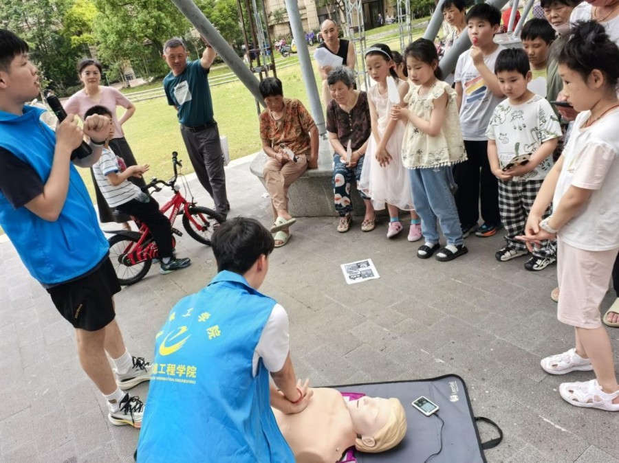 “AED的使用非常簡單,我們要懂救、會(huì)救、敢救,要在危難時(shí)刻伸出援助之手,這也是宣傳的意義”,來自鹽城工學(xué)院的大學(xué)生志愿者彭光新正專注的給居民“授課”。