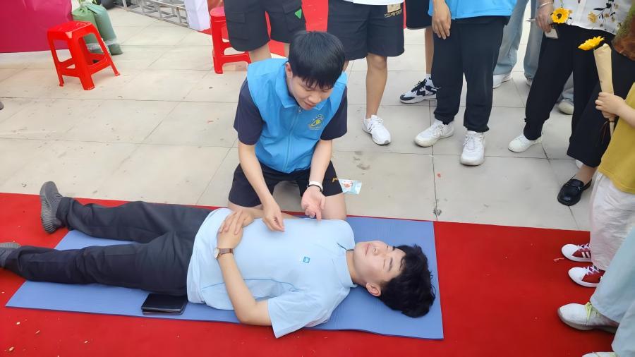 志愿者在鹽城市碧桂園天璽小區(qū)“龍蝦節(jié)”現(xiàn)場,設(shè)置模擬急救區(qū),用情景短劇再現(xiàn)“有人突然倒地”的應(yīng)急場景,吸引居民圍觀參與。