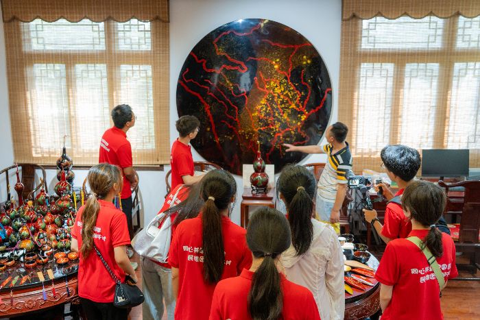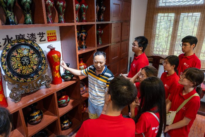 圖為實(shí)踐隊(duì)員們認(rèn)真聆聽(tīng)關(guān)于水磨漆器的講解