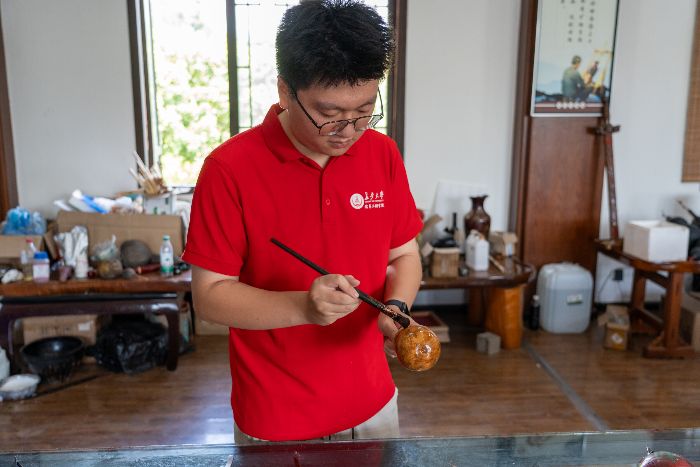 圖為團(tuán)隊(duì)成員嘗試為水磨漆器葫蘆上色