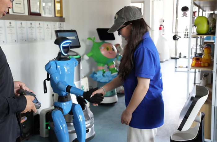 在余建指導(dǎo)下,成員們實(shí)操了宇樹機(jī)器人GO1、GO2及UnitreeH1等產(chǎn)品,見證機(jī)器人完成多方向行走、蹲起握手等動(dòng)作。成員呂宛凌在體驗(yàn)后說道,AI大模型支撐下的人形機(jī)器人“艾米”實(shí)現(xiàn)了無障礙語音交互,H1機(jī)器人的動(dòng)作響應(yīng)精準(zhǔn)流暢,“這種人機(jī)協(xié)同能力預(yù)示著AI機(jī)器人將在服務(wù)、工業(yè)等場景釋放巨大潛力”。