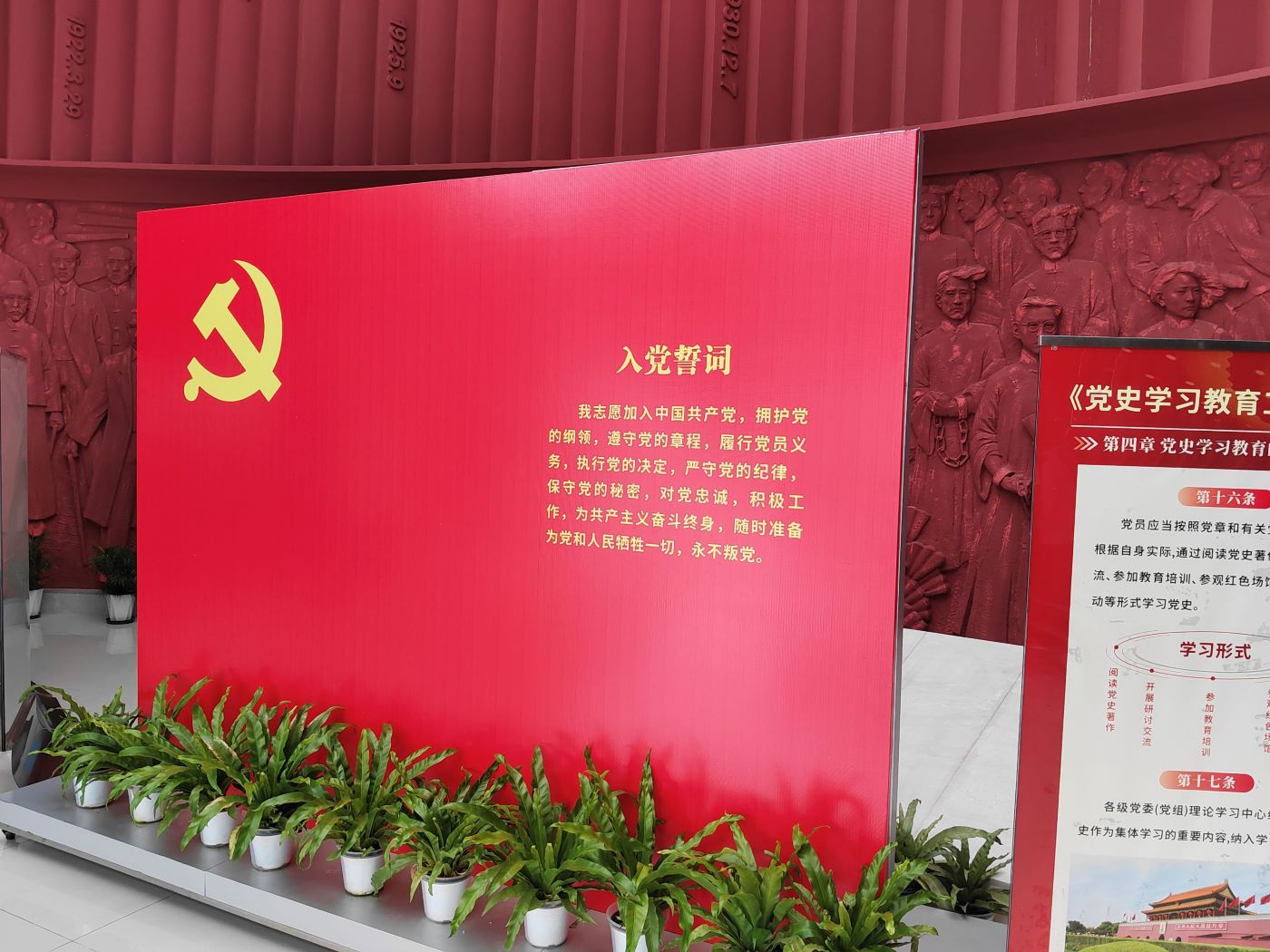 紀(jì)念館的出口處的大廳中間屹立這一塊紅色的入黨誓詞展板,莊嚴(yán)的鐮刀錘頭閃耀光芒,入黨誓詞如同一束熾熱的光,照亮信仰之路。“我志愿加入中國共產(chǎn)黨……” 這一句句誓言,是共產(chǎn)黨人對信仰的莊重承諾,承載著為黨和人民奉獻(xiàn)一切的決心。在宣誓的那一刻仿佛志愿者與革命先輩跨越了時(shí)空的界限,志愿者在革命先輩們面前莊嚴(yán)宣誓。