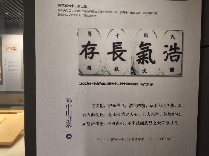 在場(chǎng)館內(nèi),團(tuán)隊(duì)成員看著孫中山先生為黃花崗七十二烈士墓題寫的“浩氣長(zhǎng)存”四個(gè)字,駐足良久。透過這四個(gè)字,仿佛傳來千年前血腥味下按耐不住的燥熱的奮起心氣。如孫中山先生所說的那樣,戰(zhàn)役必然存在犧牲,而烈士們?yōu)⑾碌臒嵫膊粫?huì)被辜負(fù)。它為堅(jiān)持染色,為發(fā)展染色,也為理想染色。