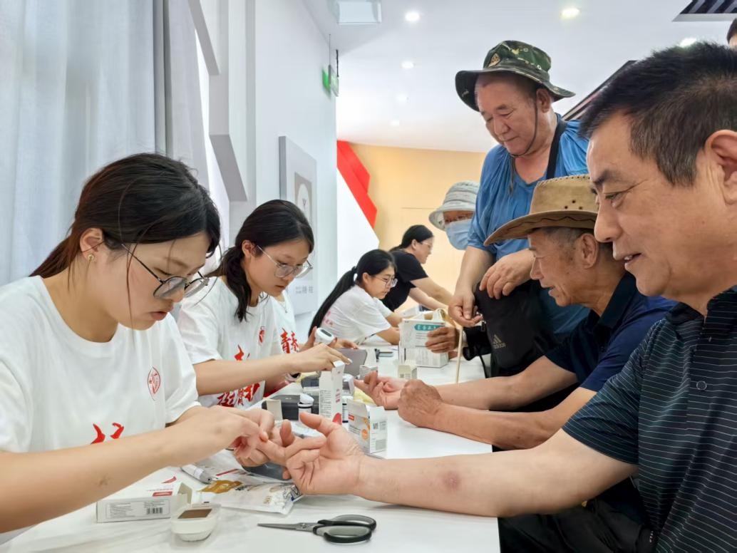 為幫助老年群體及時(shí)了解自身健康狀況,實(shí)踐團(tuán)開展血壓、血糖免費(fèi)檢測(cè)服務(wù)?;顒?dòng)現(xiàn)場(chǎng),成員們細(xì)致為老人測(cè)量數(shù)據(jù),運(yùn)用專業(yè)知識(shí)解讀結(jié)果,在詢問健康狀況后,推薦并指導(dǎo)使用“江蘇數(shù)字農(nóng)家書屋”中的相關(guān)資源,如《中老年養(yǎng)生指南》《慢性病自我管理》等電子書籍與聽書內(nèi)容,鼓勵(lì)老人通過便捷閱讀獲取科學(xué)保健知識(shí),將“治未病”融入日常生活。義診桌旁書香縈繞,健康關(guān)懷與閱讀滋養(yǎng)相得益彰,讓老人們倍感溫暖。