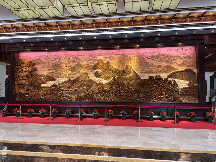 進(jìn)入中國木雕博物館,映入眼簾的是一幅描繪中國長城的木雕作品。館內(nèi)明亮通透,設(shè)有六個(gè)展廳——歷史廳、生活廳、大師廳、世界廳、竹藝廳及家訓(xùn)館。一樓還設(shè)有許多玻璃木雕館藏。