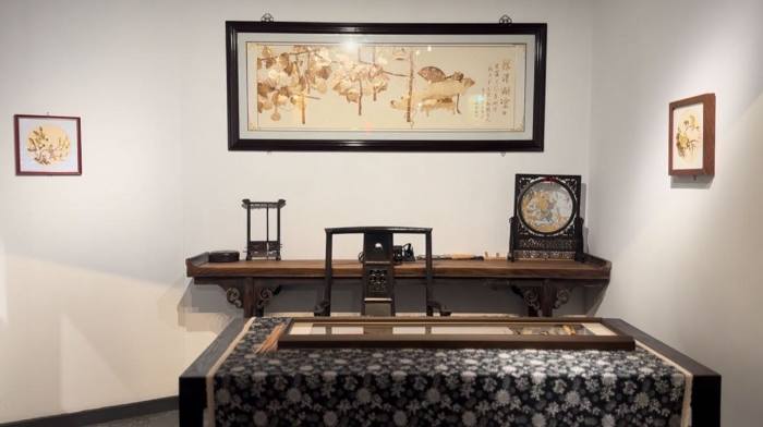 大豐麥稈剪貼展區(qū)呈現(xiàn)了麥稈的藝術(shù)轉(zhuǎn)化。大豐麥稈剪貼畫(huà)展區(qū)展現(xiàn)了化平凡為神奇的智慧。展柜中金光熠熠的花鳥(niǎo)、古樸的山水,原料竟是田間廢棄麥稈。隊(duì)員了解到,這項(xiàng)源于東漢的技藝需挑選直挺麥稈,經(jīng)蒸煮脫脂后分剝成“草皮”與“草心”。“草皮”光澤如金箔,用于表現(xiàn)高光部分;“草心”質(zhì)地樸拙,塑造厚重肌理或背景。這種對(duì)材料的極致利用,讓麥稈畫(huà)在光影中呈現(xiàn)獨(dú)特層次感,堪稱對(duì)大地饋贈(zèng)的深情表達(dá)。