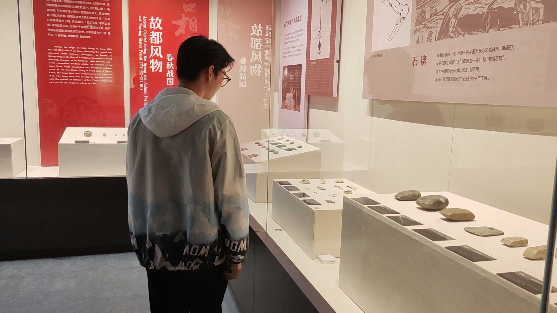 走進館內(nèi),銹跡斑斑的武器、泛黃的革命文獻、戰(zhàn)士們用過的生活用品等文物依次映入眼簾,仿佛在無聲地訴說著淮北地區(qū)軍民浴血奮戰(zhàn)的崢嶸歲月。拍攝的這張圖展現(xiàn)了紅色文化與歷史文物的時空對話,展柜中陳列的??石錛、石鑿??,其"精工巧手制作"的說明文字,與后方紅色展板"故都風物 春秋戰(zhàn)國"形成視覺呼應,暗示勞動工具從原始社會到春秋戰(zhàn)國的演進,正是人類抗爭自然、改造世界的紅色精神雛形;醒目的紅色展板"姑蘇風韻 春秋吳國",其熾烈的色彩與展板下方關(guān)于?