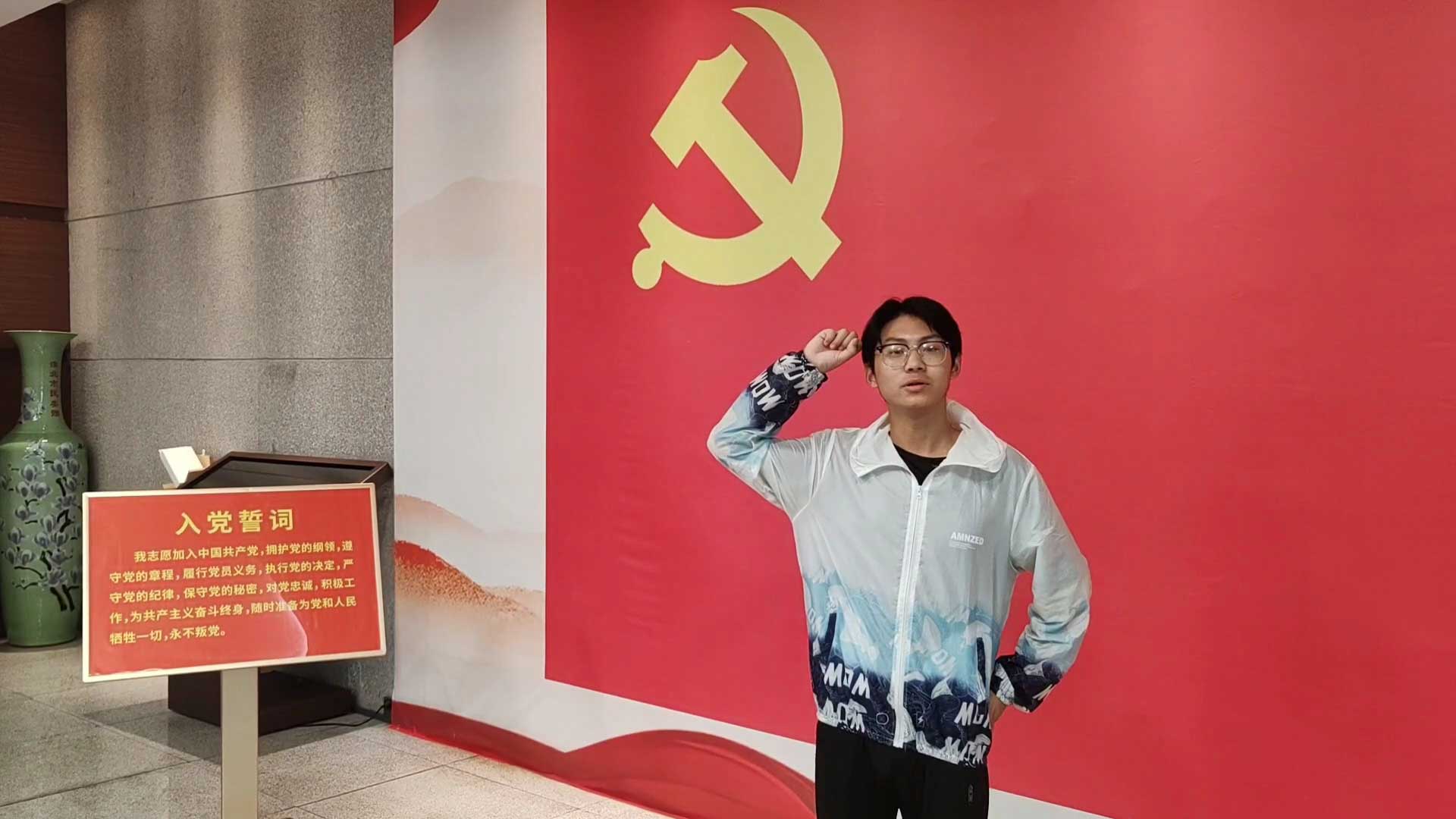 在博物館內(nèi)設(shè)置了“沉浸式宣誓角,實踐團成員身著整潔服裝,以標準姿勢重溫入黨宣誓,其挺拔的身姿和堅定的眼神,象征著新時代青年對紅色精神的主動傳承。眼鏡折射出的反光,恰似真理光芒的映照,體現(xiàn)"在黨的光輝下成長"的深刻寓意。打破了”紅色=歷史記憶“的刻板印象,證明黨的吸引力在新時代依然強大。青年知識分子的入黨選擇,更是對"黨的事業(yè)后繼有人"的生動注解。先烈的革命精神在青年們中源遠流長,生生不息。