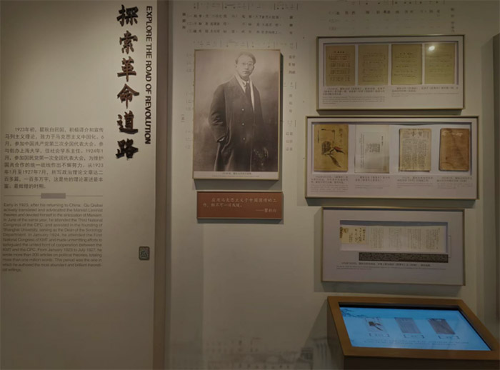 1923年,瞿秋白從蘇聯(lián)回國后,積極投身革命事業(yè)。展區(qū)內(nèi)"探索革命道路"的專題展覽,詳細(xì)記錄了他翻譯馬列著作、創(chuàng)辦上海大學(xué)、推動革命文學(xué)發(fā)展等重要貢獻(xiàn)。團(tuán)隊(duì)成員認(rèn)真觀看每一塊展板,不時(shí)駐足討論,被革命先輩堅(jiān)定的理想信念深深打動。
