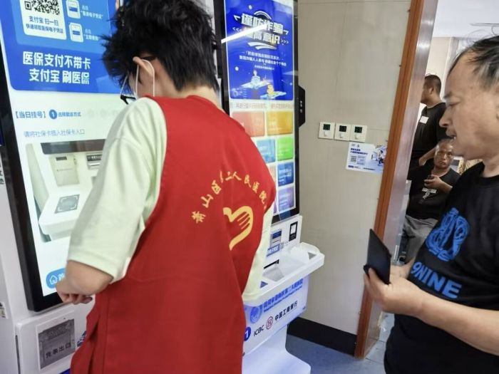 圖為實踐團于浙江省杭州市蕭山區(qū)第二人民醫(yī)院幫助老人使用自動掛號機。施佑霖 供圖