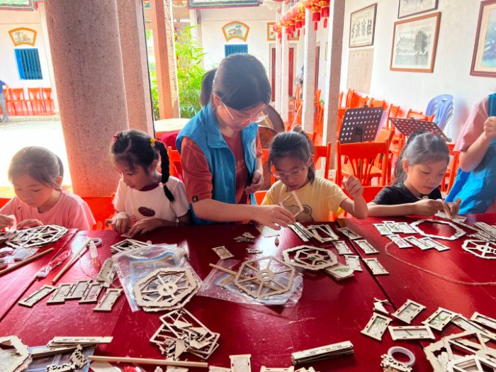 在廣東省潮州市,實踐團成員結(jié)合當?shù)孛袼组_展“花燈溢彩”活動,指導(dǎo)小朋友制作潮州花燈,傳遞了潮州花燈這一非遺技藝,更讓小朋友們對家鄉(xiāng)文化的熱愛在心中扎根。