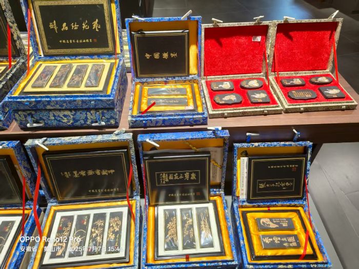 老師傅們手持細如發(fā)絲的毛筆,蘸取金粉,在素凈的墨錠上勾勒山水、花鳥、書法圖案。輕盈的筆觸精準落于方寸之間,原本質(zhì)樸的墨錠瞬間因金色紋飾而煥發(fā)生機,冰冷的墨品仿佛被注入鮮活氣韻,盡顯“墨上添金”的雅致意境。一旁的歙硯制作區(qū),匠人正打磨石材,硯臺的紋理在光影中流轉(zhuǎn),與徽墨的烏黑形成巧妙呼應(yīng),展現(xiàn)著徽州非遺“剛?cè)岵?rdquo;的特質(zhì)。
