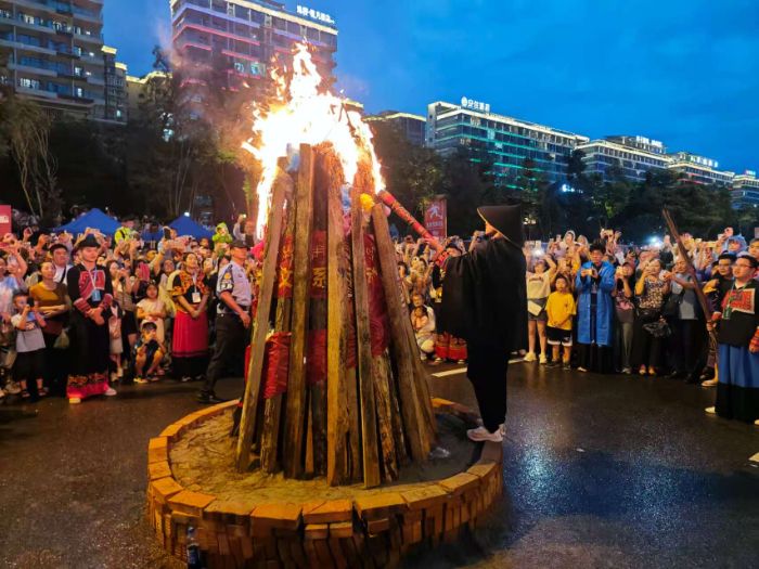 7月29日,活動(dòng)進(jìn)入高潮。謝洋被分配至東延線會(huì)場,協(xié)助點(diǎn)火儀式及游客引導(dǎo)。當(dāng)晚20:18,91個(gè)火堆齊齊點(diǎn)燃,火焰照亮夜空,他與隊(duì)友帶領(lǐng)游客跳起達(dá)體舞,場面熱鬧非凡。盡管細(xì)雨降臨,歡聲笑語未曾停歇,游客與志愿者共同喊出彝語祝福“杜澤穆薩,子默格尼”,傳遞團(tuán)結(jié)與希望?;顒?dòng)期間,謝洋還與游客合影互動(dòng),深入體驗(yàn)彝族文化。