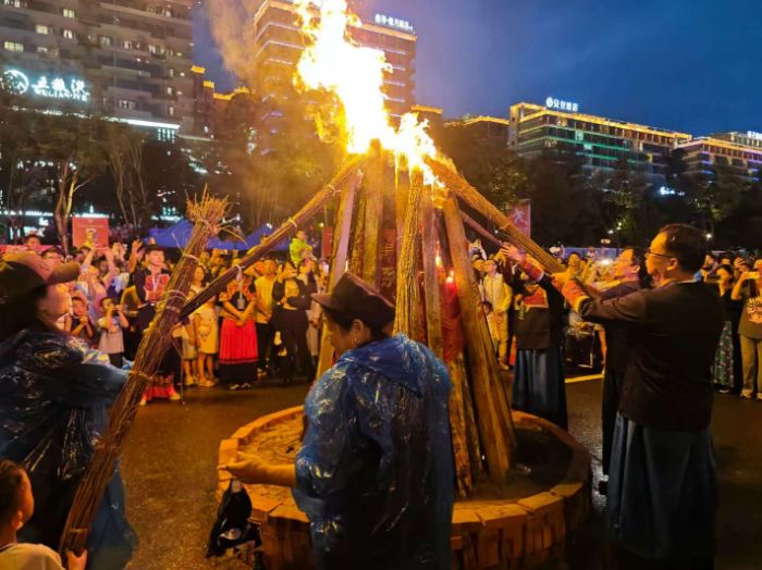 7月29日晚,火把節(jié)進入高潮。20時整,身著傳統(tǒng)服飾的“比莫”(彝族祭司)在中央火堆舉行祈福儀式并點燃圣火,火光映紅了現(xiàn)場數(shù)千名觀眾的面龐。華電民風隊志愿者分布在廣場各處,引導(dǎo)游客有序入場,耐心解答路線咨詢,并協(xié)助主持人帶領(lǐng)游客圍著火堆跳起達體舞。盡管當晚下起細雨,現(xiàn)場氣氛依然熱烈,火光與歌聲交織成節(jié)日夜空中最亮麗的景象。