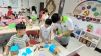 在個(gè)性DIY課堂中,團(tuán)隊(duì)成員精心設(shè)計(jì)了“制作個(gè)性垃圾桶”手工實(shí)踐課,將環(huán)保理念融入趣味創(chuàng)作,點(diǎn)亮小朋友們的創(chuàng)意火花。活動(dòng)伊始,團(tuán)隊(duì)成員戴意銘展示了利用彩紙等手工材料制作的各種創(chuàng)意垃圾桶樣品:整整齊齊的開放式垃圾桶、色彩繽紛的幾何圖案桶,甚至還有能“吃”特定垃圾的“分類小恐龍”桶……這些新奇有趣的范例瞬間點(diǎn)燃了小朋友們的熱情。在團(tuán)隊(duì)成員的指導(dǎo)和啟發(fā)下,小朋友們紛紛開動(dòng)腦筋,構(gòu)思起自己心目中的理想垃圾桶,并在團(tuán)隊(duì)成員的耐心協(xié)助下安全使用工具,利用彩紙進(jìn)行剪裁、拼貼、涂鴉、裝飾,忙得不亦樂乎。“看!我的‘小魚桶’嘴巴張得大大的,專門‘吃’塑料瓶!”一位小朋友興奮地向同伴展示自己的作品。親手制作垃圾桶的過程不僅鍛煉了小朋友們的動(dòng)手能力和合作精神,更讓他們?cè)跐撘颇屑由盍藢?duì)垃圾分類的理解。團(tuán)隊(duì)成員王逸威也深有體會(huì):“看到小朋友們專注創(chuàng)作的眼神和完成作品后的喜悅,我們也感到十分快樂。我們希望這堂手工課能像一顆種子,讓垃圾分類的理念在他們心中冒出綠芽。”