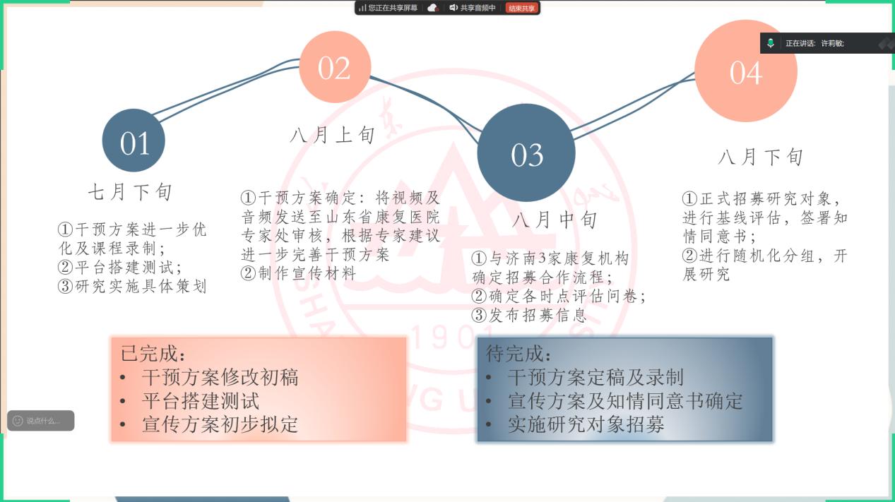 在總結(jié)第一階段經(jīng)驗(yàn)和成果的基礎(chǔ)上,隊(duì)長(zhǎng)對(duì)后續(xù)任務(wù)進(jìn)行了部署安排。團(tuán)隊(duì)成員將根據(jù)專家審核建議進(jìn)一步修改課程講稿、課件,并在定稿后完成課程的錄制,并強(qiáng)調(diào)錄制時(shí)當(dāng)注意語(yǔ)調(diào)、語(yǔ)速等相關(guān)問題;進(jìn)一步完善宣傳方案并制定研究所需的知情同意書和相關(guān)量表;團(tuán)隊(duì)將根據(jù)研究需要,與濟(jì)南市三家康復(fù)機(jī)構(gòu)合作并發(fā)布招募信息,招募研究對(duì)象并開展研究。