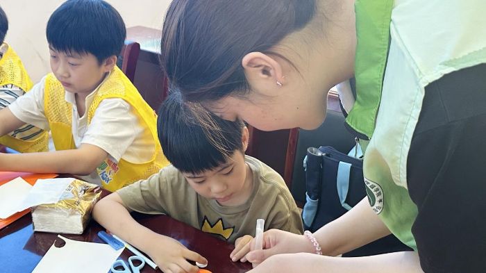 在樹葉貼畫課上,我從生活中常見的一些景色入手,給孩子們展示了許多我們?nèi)粘I钪械臉淙~美學,再由淺入深引導孩子們思考樹葉在日常生活中給我們帶來的作用,之后我和團隊其他同學一起給孩子們分發(fā)樹葉和材料,鼓勵他們發(fā)揮自己的想象力。普通的落葉在孩子們手中煥發(fā)了新的生命。有的用橢圓形的葉子做小魚的身體,有的用細長的葉子做樹木的枝條,還有的把不同顏色的葉子組合成可愛的小動物??粗切┍磺镲L拂落的自然饋贈,因孩子們的創(chuàng)意而重獲生機,我忽然明白:美從不在遠方,而在對身邊事物的珍視與想象中。社區(qū)負責老師說“用雙手變廢為寶”,這句話讓我深受觸動——教育的意義,或許就是教會孩子在平凡中發(fā)現(xiàn)不凡,用創(chuàng)造力為生活添彩。
