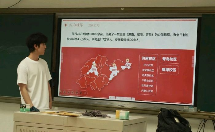 宣講中,林辰軒對照精心打磨的PPT,從創(chuàng)辦初心講起山大歷史,細數(shù)抗戰(zhàn)時期師生輾轉(zhuǎn)辦學(xué)的堅守、新時代的蓬勃發(fā)展,讓同學(xué)們觸摸到百年學(xué)府的厚重。他生動描繪校園生活:學(xué)術(shù)社團的思維碰撞、文藝社團的精彩展演、體育社團的熱血賽事,還有配備空調(diào)與獨立衛(wèi)生間的溫馨宿舍,讓大家仿佛提前體驗山大生活。