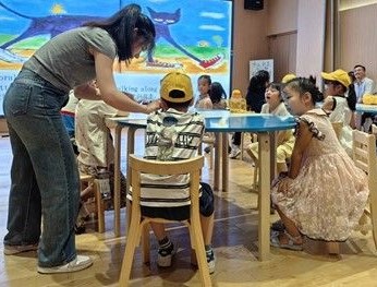 活動(dòng)現(xiàn)場(chǎng),主講志愿者通過(guò)生動(dòng)的肢體語(yǔ)言和豐富的表情,帶領(lǐng)孩子們走進(jìn)Pete the Cat的奇妙世界。當(dāng)講到Pete的白鞋子變成紅色時(shí),志愿者拿出準(zhǔn)備好的道具鞋子進(jìn)行演示,引發(fā)孩子們陣陣笑聲。