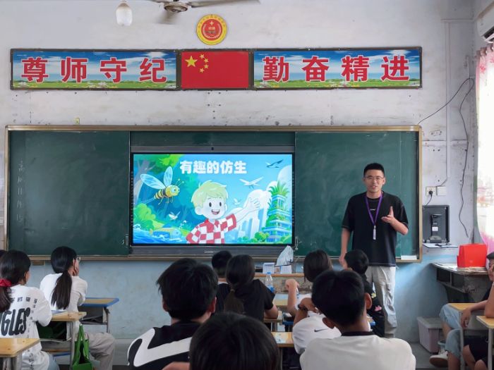 河南商丘的支教工作中,團(tuán)隊在多所鄉(xiāng)村小學(xué)開展教學(xué)活動,以探索高校與鄉(xiāng)村之間可持續(xù)的教育模式。7 月 8 日至 18 日,張博陽在睢縣鄉(xiāng)村小學(xué),結(jié)合當(dāng)?shù)刈匀画h(huán)境優(yōu)勢,開設(shè) “有趣的仿生”“動物法庭” 等生物學(xué)課程,巧妙融合生物學(xué)、物理學(xué)與邏輯學(xué)知識,極大拓展了學(xué)生們的視野。在整個教學(xué)實踐結(jié)束之后,他主動反思不足,認(rèn)識到教學(xué)要從鄉(xiāng)村學(xué)生的認(rèn)知水平以及生活環(huán)境出發(fā),從而形成貼合實際的教學(xué)思想。7 月 12 日至 8 月 13 日,徐可昕在包公廟小學(xué),圍繞 “觀察現(xiàn)象 — 探究原理 — 實踐應(yīng)用” 主線,結(jié)合農(nóng)村特色設(shè)計 “貼近生活” 主題活動。通過土電話制作、彩虹瓶實驗、生態(tài)瓶制作等低成本活動,滲透環(huán)保理念,讓學(xué)生認(rèn)識到科學(xué)的實用性與可及性,展現(xiàn)了師范生因地制宜開展教學(xué)的專業(yè)能力。