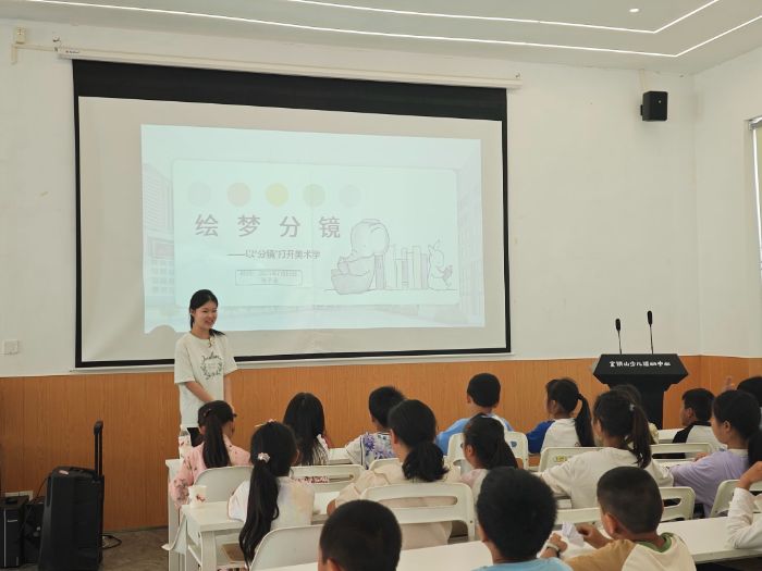美術(shù)課程部分,授課隊(duì)員向同學(xué)們引入分鏡繪畫(huà)的新概念,以貼近小朋友日常生活的動(dòng)畫(huà)片為切入點(diǎn),講解分鏡格子與故事情節(jié)的聯(lián)系。在隊(duì)員的指導(dǎo)下,一個(gè)個(gè)小小的身影俯身趴在桌子上,拿著畫(huà)筆在白紙上小心翼翼地勾勒,眼中美好盡投射筆尖,心中激蕩皆繪入紙簾。